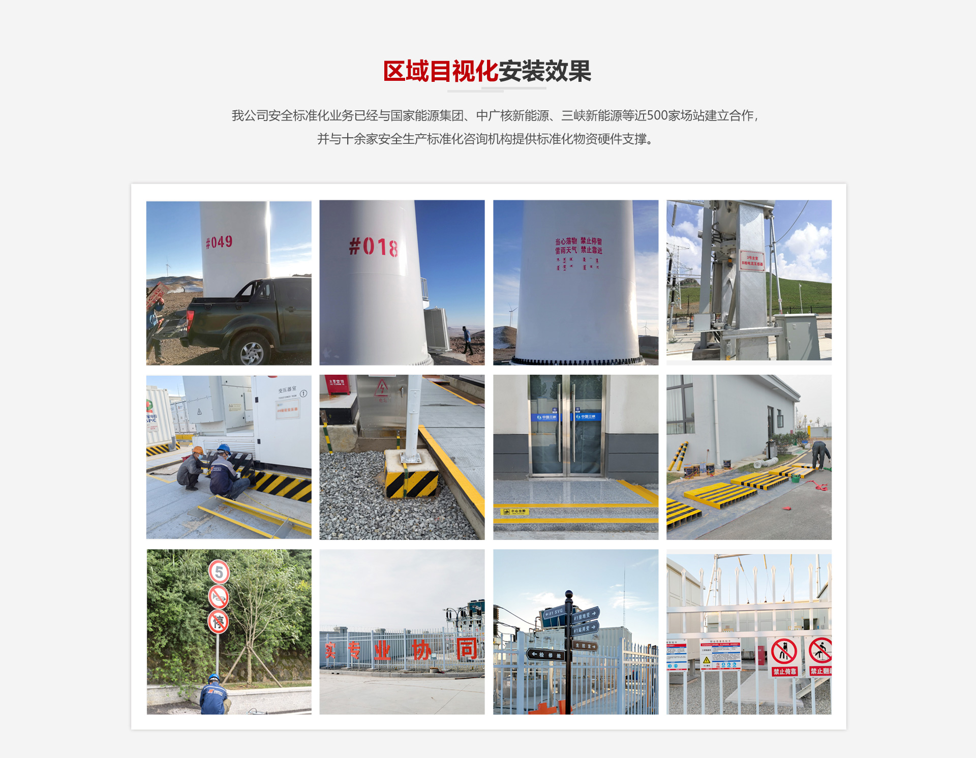 我公司安全標(biāo)準(zhǔn)化業(yè)務(wù)已經(jīng)與國家能源集團、中廣核新能源、三峽新能源等近500家場站建立合作,并與十余家安全生產(chǎn)標(biāo)準(zhǔn)化咨詢機構(gòu)提供標(biāo)準(zhǔn)化物資硬件支撐。