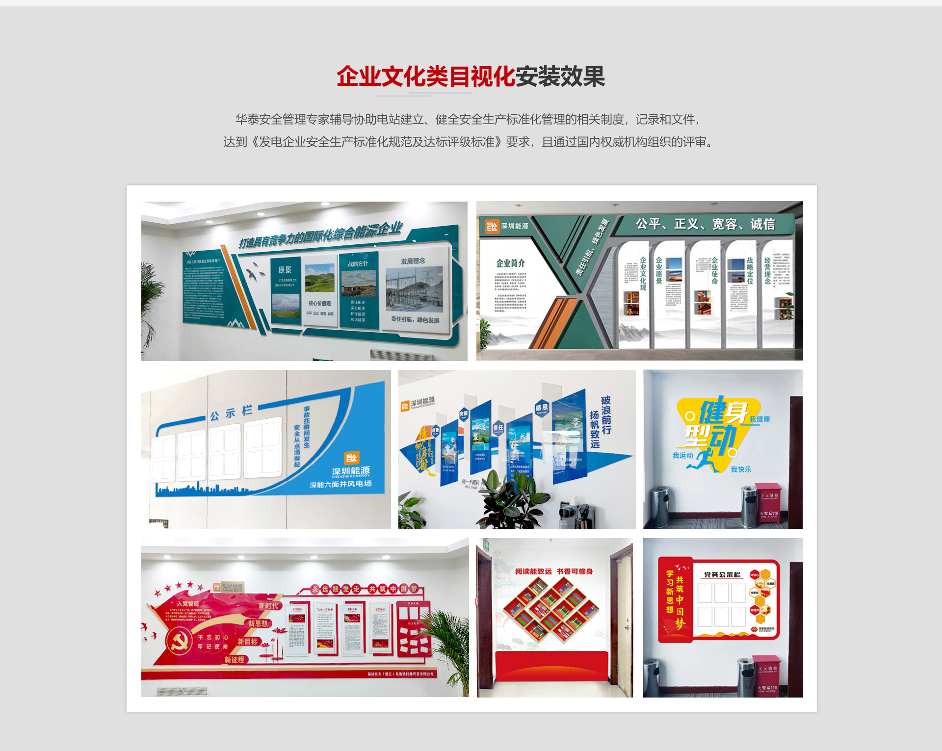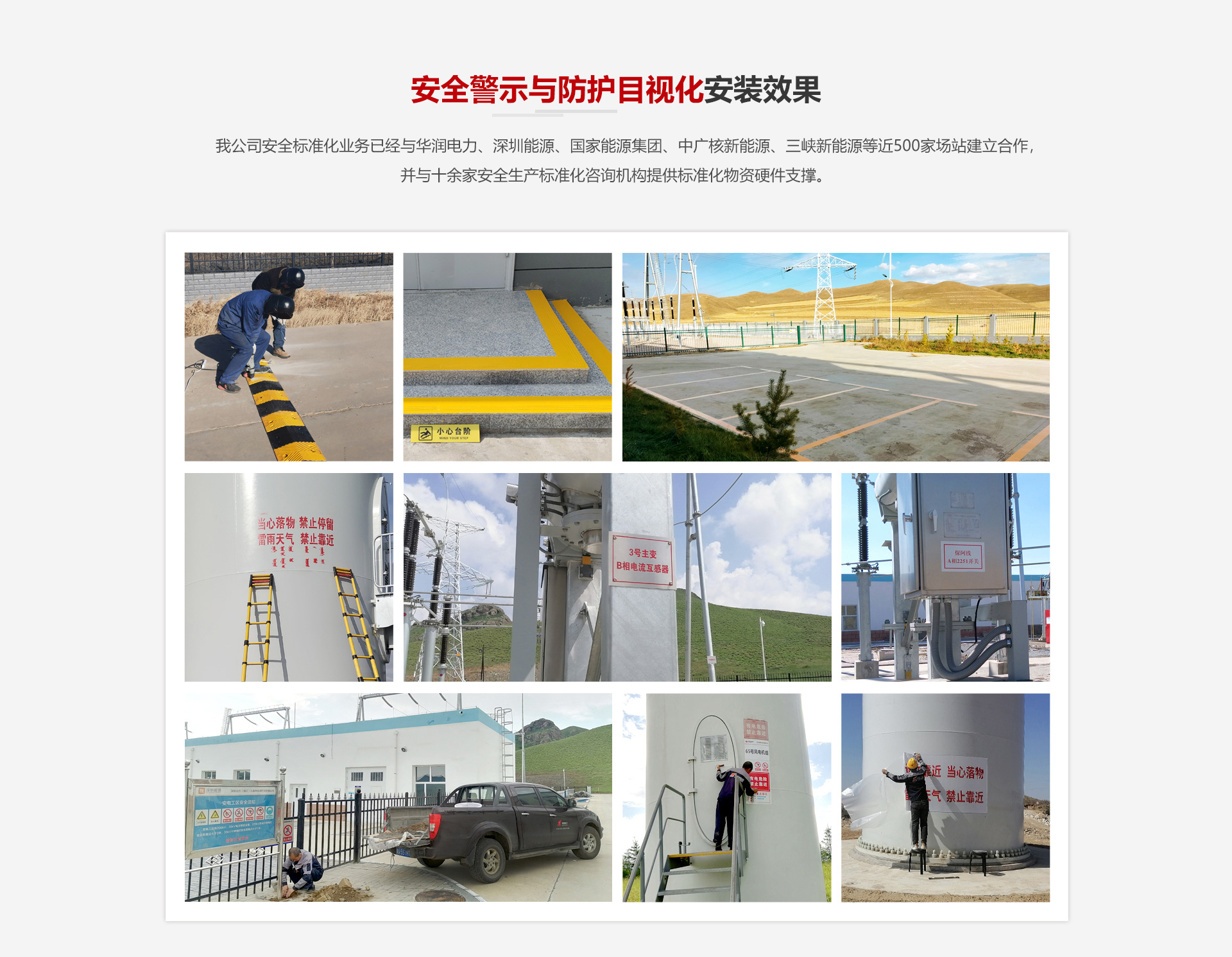 我公司安全標準化業(yè)務(wù)已經(jīng)與國家能源集團、中廣核新能源、三峽新能源等近500家場站建立合作,并與十余家安全生產(chǎn)標準化咨詢機構(gòu)提供標準化物資硬件支撐。