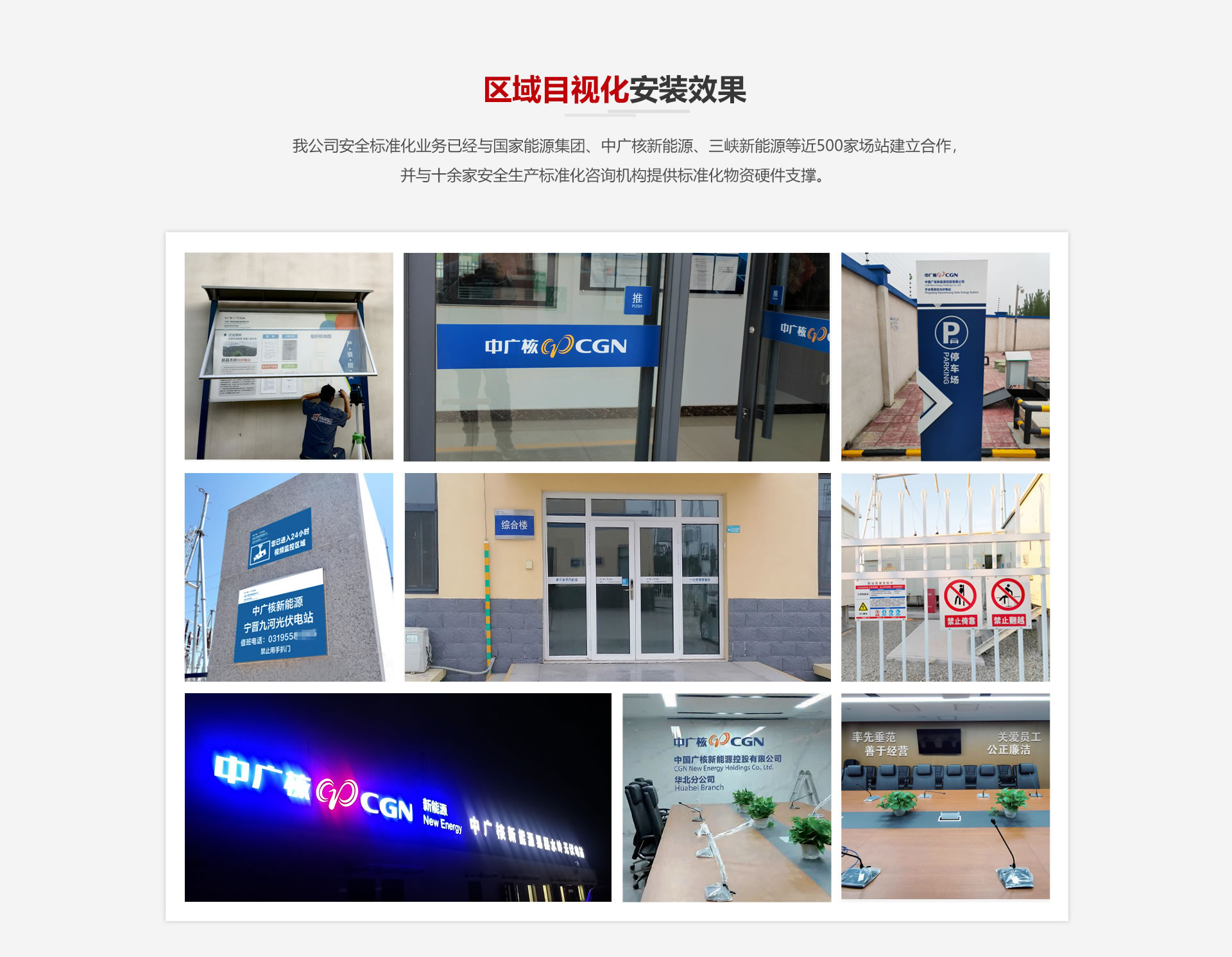 我公司安全標(biāo)準(zhǔn)化業(yè)務(wù)已經(jīng)與國家能源集團(tuán)、中廣核新能源、三峽新能源等近500家場站建立合作,并與十余家安全生產(chǎn)標(biāo)準(zhǔn)化咨詢機構(gòu)提供標(biāo)準(zhǔn)化物資硬件支撐。