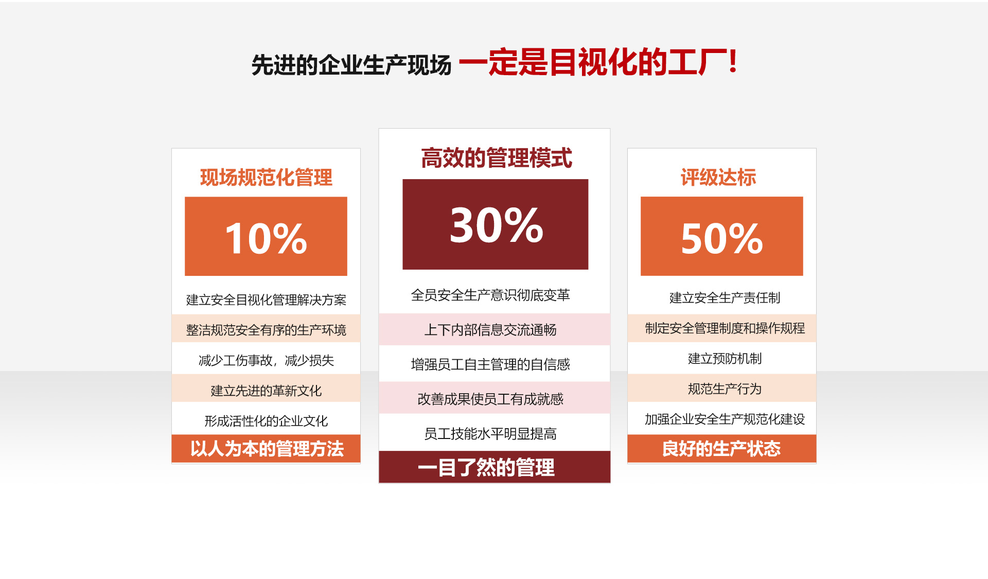華泰安全目視化管理以安全法律、法規(guī)、標(biāo)準(zhǔn)和危害識別風(fēng)險評價為基礎(chǔ),運(yùn)用標(biāo)識警示、6S管理、看板管理、定置管理等方法,結(jié)合企業(yè)VI、生產(chǎn)的特點(diǎn)、安全管理現(xiàn)狀,將各方內(nèi)容融合,策劃一套系統(tǒng)的安全目視化管理解決方案。