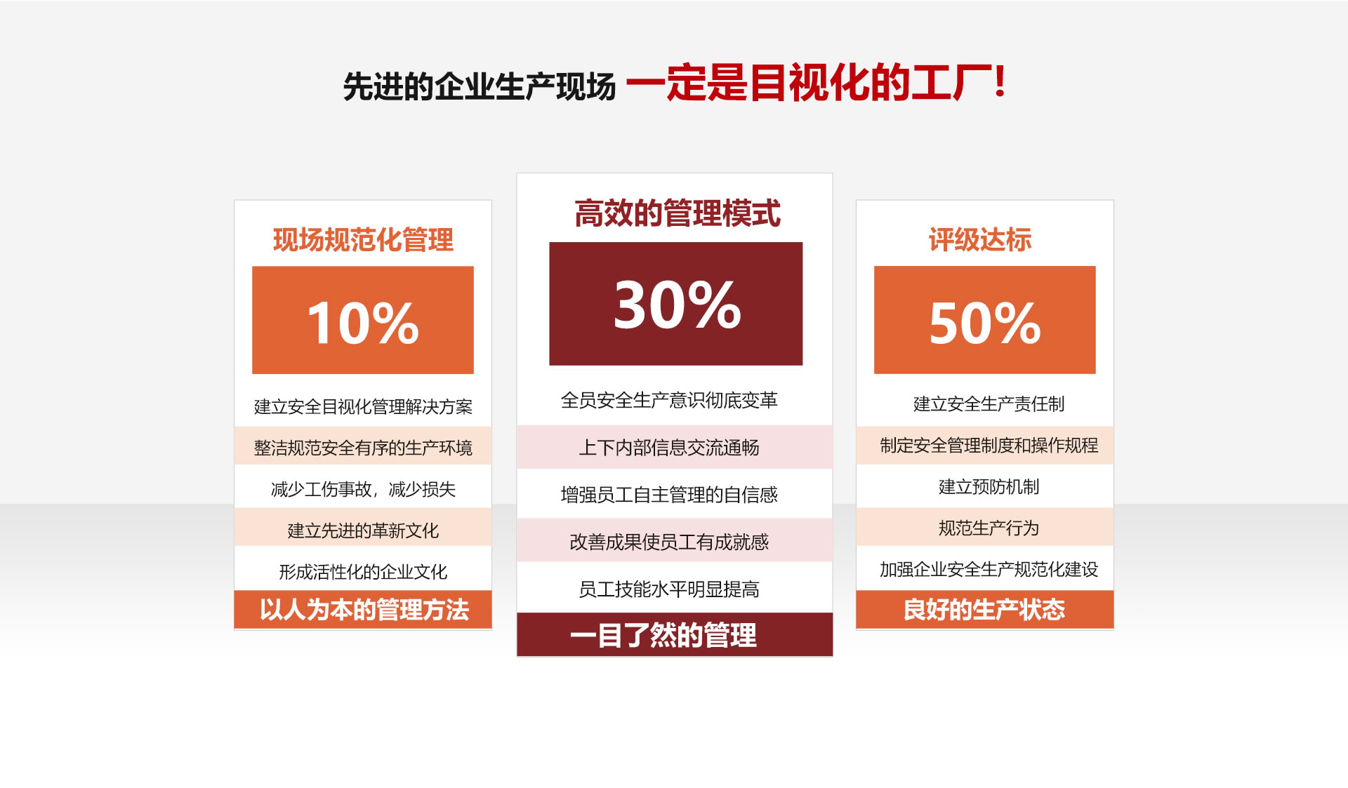 華泰安全目視化管理以安全法律、法規(guī)、標(biāo)準(zhǔn)和危害識(shí)別風(fēng)險(xiǎn)評(píng)價(jià)為基礎(chǔ),運(yùn)用標(biāo)識(shí)警示、6S管理、看板管理、定置管理等方法,結(jié)合企業(yè)VI、生產(chǎn)的特點(diǎn)、安全管理現(xiàn)狀,將各方內(nèi)容融合,策劃一套系統(tǒng)的安全目視化管理解決方案。