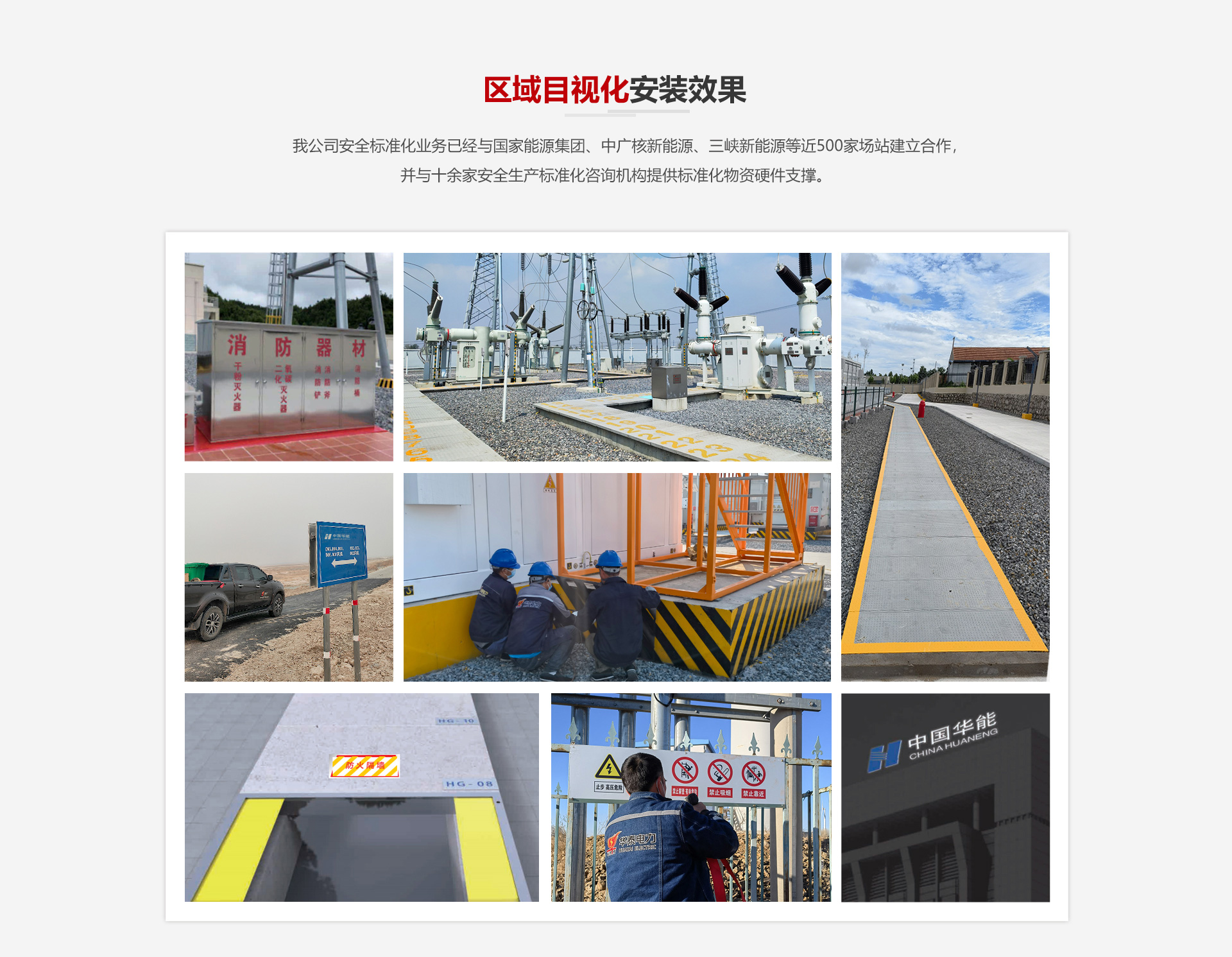 我公司安全標(biāo)準(zhǔn)化業(yè)務(wù)已經(jīng)與國家能源集團(tuán)、中廣核新能源、三峽新能源等近500家場站建立合作,并與十余家安全生產(chǎn)標(biāo)準(zhǔn)化咨詢機(jī)構(gòu)提供標(biāo)準(zhǔn)化物資硬件支撐。